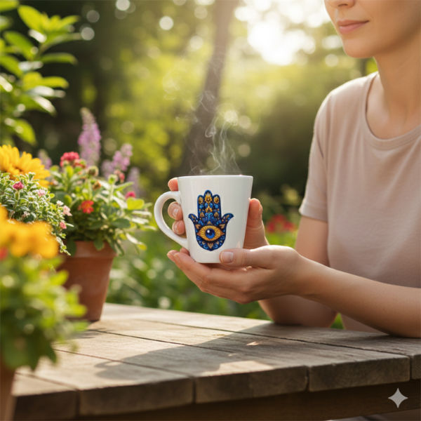 Esta taza combina dos símbolos ancestrales de protección y buena suerte: