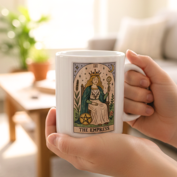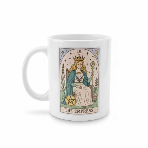 Esta taza está inspirada en La Emperatriz, arcano que simboliza la creatividad, la fertilidad, la abundancia y la energía femenina en su máxima expresión. Su diseño detallado y armonioso la convierte en una pieza especial para acompañar tus rituales diarios, meditaciones o simplemente tus momentos de bienestar.
