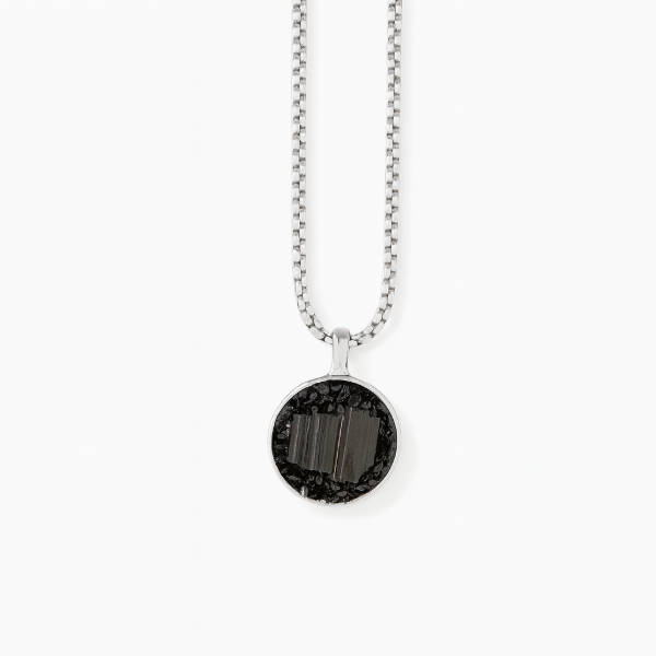 Este collar presenta un dije circular con turmalina negra natural, una de las piedras más poderosas para la protección energética y el bloqueo de energías densas. Esta pieza combina estética moderna con un fuerte propósito espiritual.