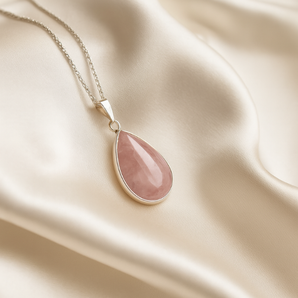 Este collar de Cuarzo Rosa, con virola bañada en plata, irradia una energía suave y amorosa que favorece la calma emocional y el amor propio. Es una piedra ideal para quienes desean conectar con la ternura, la compasión y la sanación del corazón.
