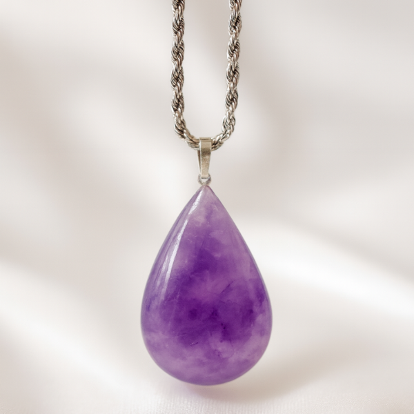 Este delicado collar de Amatista destaca por su piedra en forma de gota, presentada sobre una superficie satinada que realza su tono violeta profundo. La amatista es conocida por su energía calmante y su capacidad para armonizar la mente, equilibrar las emociones y potenciar la intuición.
