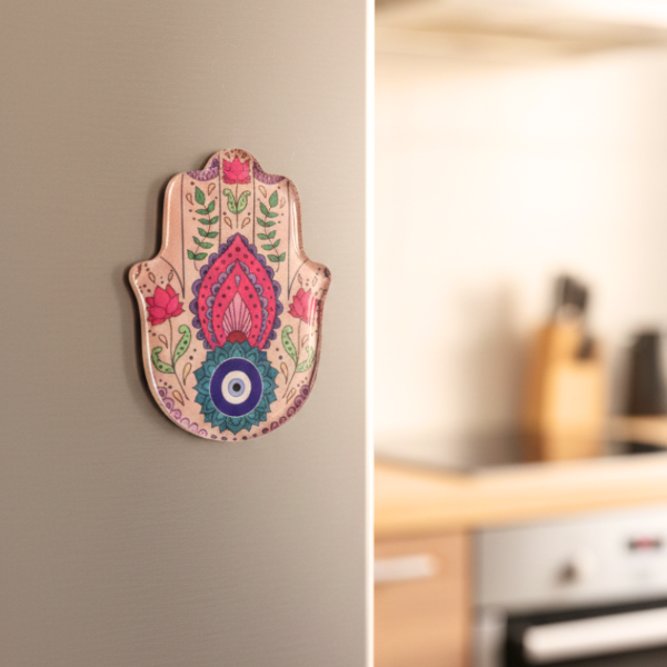 La Mano Hamsa es un símbolo ancestral de protección que aleja energías negativas y atrae bienestar. Este diseño con imán es perfecto para colocar en la heladera, puertas metálicas o cualquier superficie imantada, decorando y energetizando tu hogar a la vez.