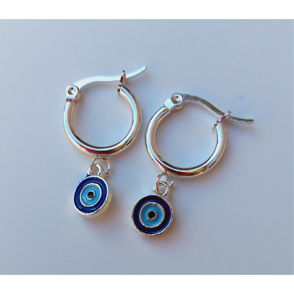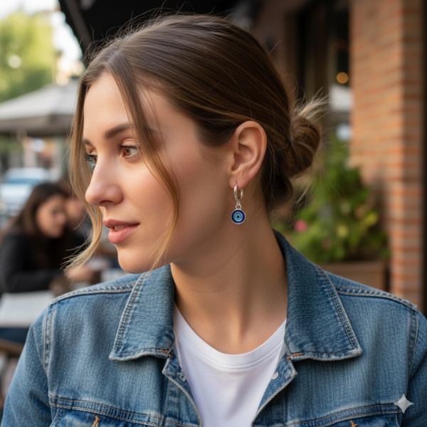 Estos aros de acero blanco con dijes de Ojo Turco combinan estilo minimalista y energía protectora. El ojo turco es un amuleto tradicional que resguarda contra la envidia, el mal de ojo y las energías densas, atrayendo armonía y buena fortuna.