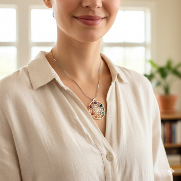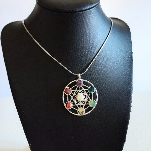 Hermoso dije con baño en plata del cubo de Metatrón con piedras naturales 7 chakras. Incluye cadena de acero quirúrgico de 50 cm