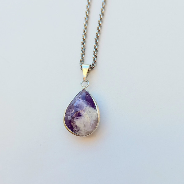 Este dije presenta una piedra natural en forma de gota pulida con virola con baño en plata, que resalta sus vetas únicas en tonos lilas y blancos.