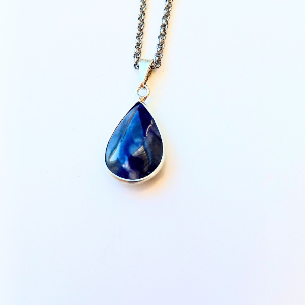 Este dije presenta una piedra natural en forma de gota pulida con virola con baño en plata, que resalta sus matices azul índigo y vetas blancas naturales.