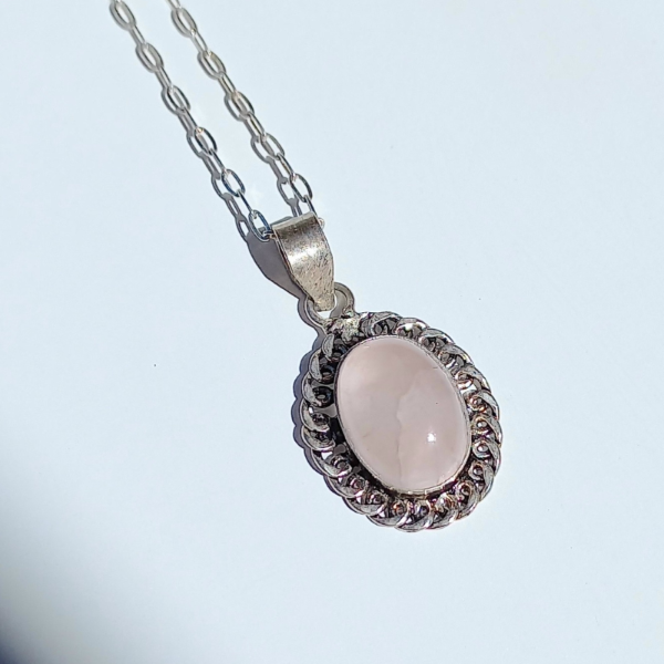 El Cuarzo Rosa es la piedra del amor incondicional, la dulzura y la paz interior. Este dije presenta una piedra natural tallada en corte cabujón ovalado, engarzada en plata con marco trenzado, que realza su brillo suave y su tonalidad rosada.