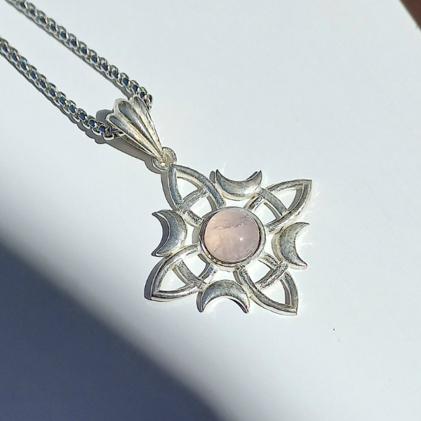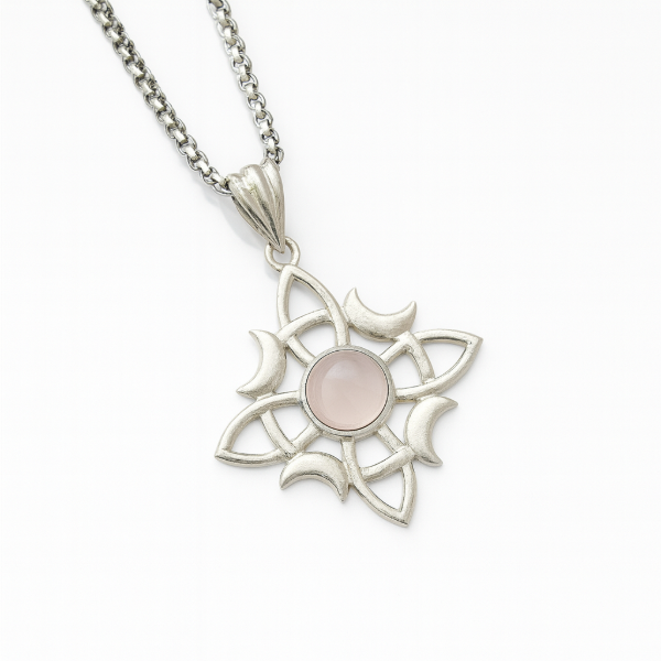 El diseño en baño de plata realza su geometría sagrada, mientras que el cuarzo rosa en el centro potencia la armonía, la dulzura y la conexión con el corazón.
