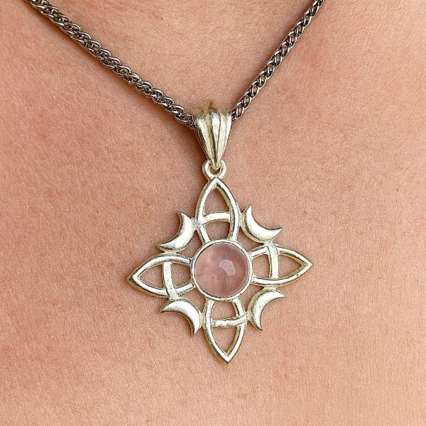 Este collar combina el Nudo de Bruja, símbolo ancestral de protección mágica, con la suavidad energética del Cuarzo Rosa, piedra del amor propio, la calma y la sanación emocional.